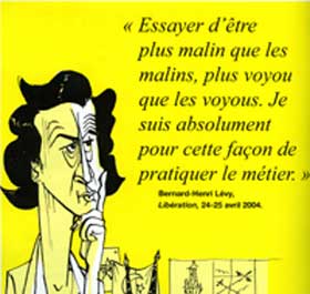 Objet d’une vénération vénale par ces flagorneurs journalistiques, la statuette BHL sait combien cette fidélité mercantile que lui vouent ces plumitifs d’holding industriels est le meilleur gage de son invulnérabilité. « Il suffit de trouver dans chaque rédaction des affidés qui lui doivent tous quelque chose (complément de salaire, position sociale, honneur quelconque)… et de les activer au gré de ses besoins promotionnels. Du clientélisme classique appliqué à la gent intellectuelle. »