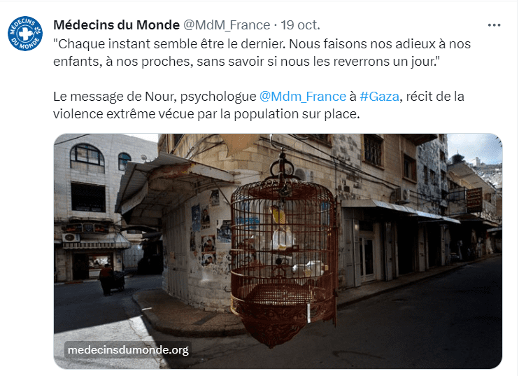 D’un courage exemplaire, cette psychologue palestinienne oeuvre au sein de Médecins du Monde, dont il faut saluer le travail remarquable accompli sur un terrain miné, sur une terre de souffrances, depuis de longues années.(voir son message ci-dessous)