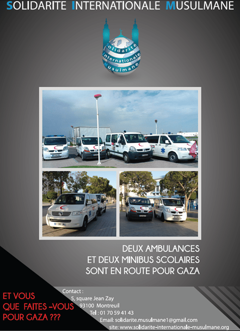 Sous la noble bannière de l’humanitaire, un convoi exceptionnel a quitté Montreuil, le 4 juillet dernier, pour prendre la route vers Gaza, avec à son bord les membres enthousiastes, déterminés et vaillants de l’association Solidarité Internationale Musulmane (SIM), lesquels, en partenariat avec l’association tunisienne Tounes Al-Khayr, qui a de son côté récolté 3 000 litres d’huile d’olive, se sont fixés une belle mission : acheminer vers l'enclave palestinienne 4 véhicules, dont 2 minibus seront destinés au transport d’enfants et 2 autres feront fonction d’ambulances, ainsi que du matériel de santé dont les hôpitaux locaux sont cruellement dépourvus.