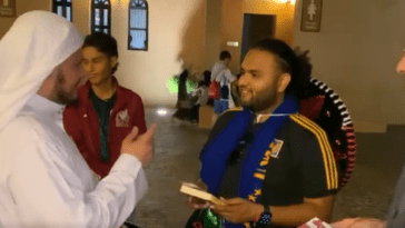 Des militants du collectif Ibiza organisent un match de foot avec un ballon plongé dans du sang factice, devant le siège de la Fédération française de football, à Paris, pour symboliser la souffrance des ouvriers migrants morts ou blessés sur les chantiers liés au Mondial de football au Qatar.