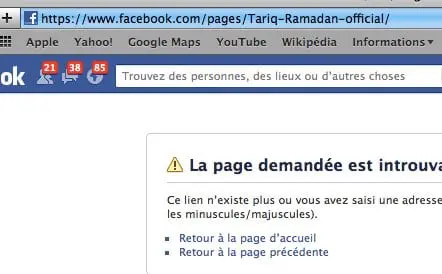 C’est ce deuxième cas de figure que vient de subir Tariq Ramadan, dont la page s’est soudainement volatilisée hier, ainsi que celle d'autres prédicateurs et de la blogueuse Oum Zaza, sans que l’on sache quel(s) censeur(s) islamophobe(s) était à la manoeuvre derrière son écran pour s’autoriser une telle liberté.