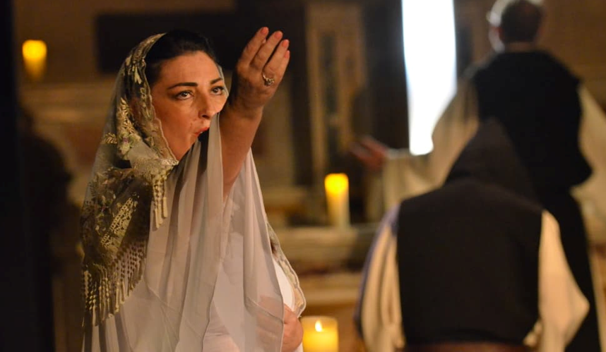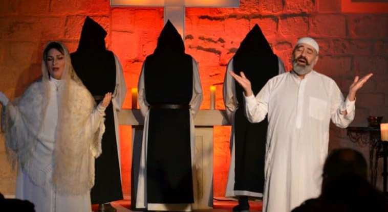 Allez voir ce magnifique spectacle dans un cadre pour le moins hors du commun à la Chapelle des Italiens[1], en plein cœur d’Avignon non loin de la cité des Papes. La résonance des voix, notamment la soprano Valéria Florencio incarnant la Vierge Marie accompagnée parfois par la magnifique voix ténor du chrétien libanais Joseph Naffa interprétant l’imam faisant l’Azhan (et en d’autres apparitions jouant un terroriste du GIA encagoulé) et s’exprimant dans un parfait arabe. De même que les dialogues entre prêtres joués par Pascal Joumier, Yves Sauton, Dominick Breuil, laisseront une profonde empreinte. A cela s’ajoute la splendeur du lieu qui vous touche en plein cœur à l’instar des voûtes, des ogives, la hauteur des colonnes, et les bougies au milieu des ténèbres comme lors d’une communion ou prière. Voyage œcuménique et spirituel dans ce qui unit le plus profondément les humains, à savoir l’espoir, la justice, la paix, la liberté, l’égalité, la fraternité, l’amour, et surtout la compréhension et l’acceptation de l’Autre, quel qu’il soit.