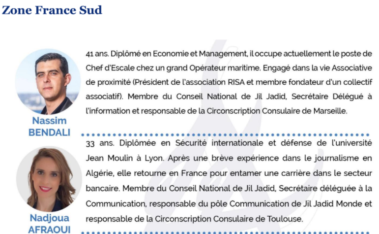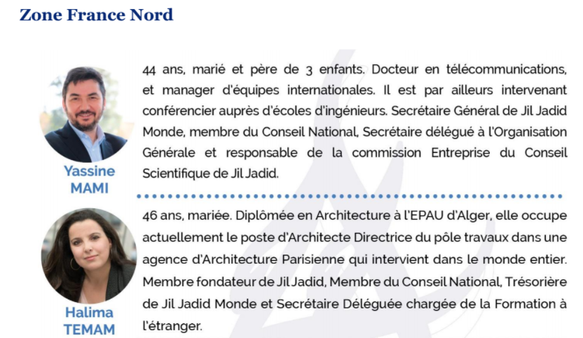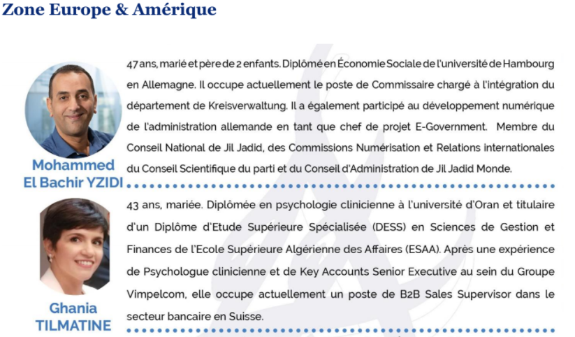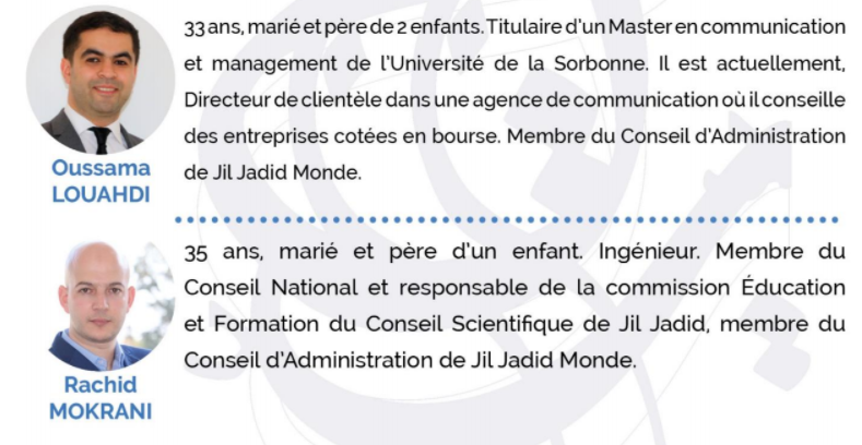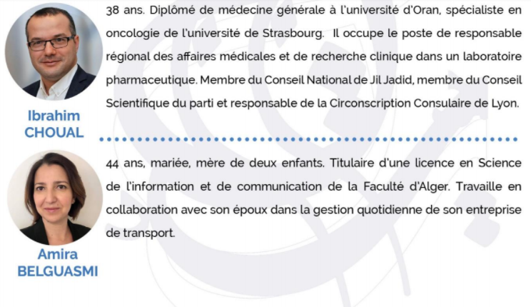 Les différents candidats qui défendent les couleurs de Jil Jadid en France, en Europe et en Amérique