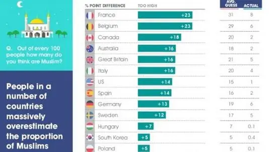 En France, les personnes interrogées jugent que 31% de la population est musulmane, alors qu'en réalité seuls 8% des habitants le sont. En Grande-Bretagne, le pourcentage réel de musulmans est de 5%, mais les personnes interrogées l'estiment à 21%, soit quatre fois plus.