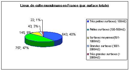 Des 1612 lieux de culte musulmans pour lesquels nous avons les données chiffrées de la surface totale, –surface culte et surfaces annexes- seuls 65 d’entre eux, c’est-à-dire 4%, ont une surface totale supérieure à 1000 m2 et 86% n’atteignent pas les 500 mètres carrés de surface totale chacun. En fait la catégorie des très petites surfaces de moins de100m2 compte à elle seule 643 lieux de culte et représente 40% du total.