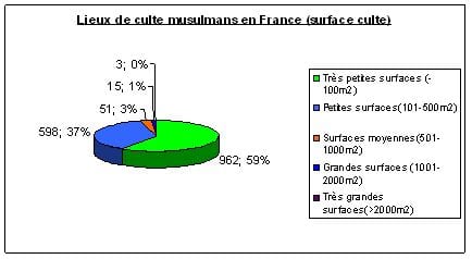 La surface totale d’un lieu de culte n’exprimant pas forcément sa capacité d’accueil ; la surface allouée au culte proprement dit illustre mieux cette carence et cette exiguïté. Parmi les 1629 lieux de culte qui ont déclaré les surfaces attribuées au culte, les très petites surfaces (-100m2) et les petites surfaces (101- 500 m2) totalisent 1560 lieux de culte soit 96% de l’ensemble. Seules deux mosquée se situent dans la catégorie des 2001m2-3000 m2 et la mosquée d’Evry qui avance le chiffre de 5000m2 de surface culte.