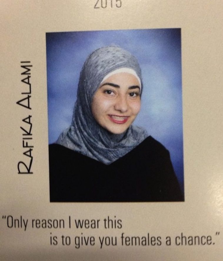 En Californie, du haut de ses 17 ans, l’espiègle Rafika Alami a souhaité renouveler le genre en optant pour une petite phrase pleine de malice visant à faire sourire et peut-être même rire, et qui a fait mouche au-delà de ses espérances, notamment sur Twitter et Tumblr. Prenant la pose radieuse, le visage délicatement entouré par un hijab qui n’est pas l’ennemi de la joie, la jeune fille a choisi de mettre en exergue sous son portrait une petite pique en forme de boutade à l’adresse de ses congénères, qui a démontré de manière subtile que l’on peut être voilée, attachée à ses valeurs musulmanes et non dénuée d’humour.