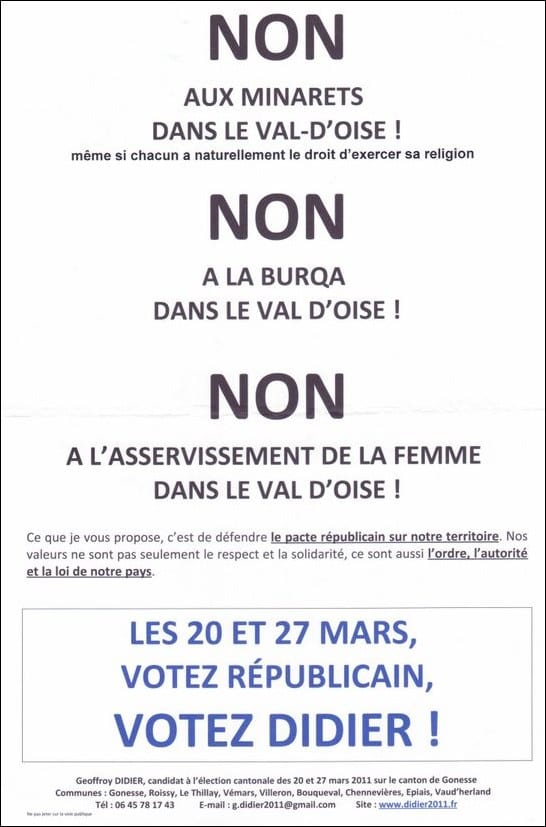 Parachuté dans le département pour s’emparer d’un bastion de la gauche, Geoffroy Didier use facilement d’un vocabulaire martial, se qualifiant lui-même d’« artisan de la reconquête » sur une « terre de combat ». En attendant une nouvelle Reconquista face aux modernes Maures, ce partisan déclaré de « l’ordre, l’autorité et la loi de notre pays » s’est formé à bonne école : de 2005 à 2010, il était le conseiller de Brice Hortefeux, notamment au ministère de l’Immigration et de l’Intérieur. Diplômé de Sciences Po et de l’Essec, passé par les prestigieuses universités de Harvard et Columbia, Geoffroy Didier, avocat de profession, démontre, s’il en était besoin, que la valeur intellectuelle d’un homme politique n’est pas nécessairement synonyme de probité morale et d’éthique républicaine. En désignant explicitement l’identité d’un ennemi à ses électeurs, Geoffroy Didier incarne, à sa mesure, la lepénisation en cours de l’UMP. Cet amalgame, récurrent dans le discours actuel, entre l’édification de minarets, la burqa et « l’asservissement de la femme » participe du regain de l’islamophobie dans l’opinion publique.
