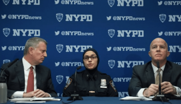 Revenue sous les feux des projecteurs, bien malgré elle, l’agent de police voilée qui fait l’unanimité parmi ses pairs est apparue, la semaine dernière, aux côtés du maire de New York, Bill de Blasio (à gauche sur la photo ci-dessus) et de Eric Adams (à droite), entourée des membres du bureau du syndicat policier musulman, pour raconter publiquement la brutalité de l’attaque islamophobe qui l’a prise pour cible, elle et son fils, au seul motif qu’elle arborait un hijab.