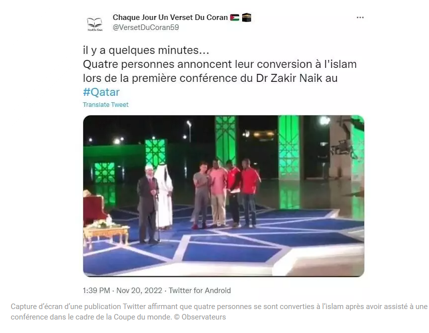 Depuis le 20 novembre 2022, une vidéo est partagée par des comptes qui affirment qu’on y voit quatre personnes venues au Qatar pour la Coupe du monde de football s’étant converties à l’islam après une conférence du télévangéliste indien Zakir Naik. Si elle montre bien la conversion d’individus ayant assisté à une telle conférence, celle-ci datait de mai 2016. Il s’agit donc d’une vieille vidéo qui n’a aucun lien avec la Coupe du monde actuelle.