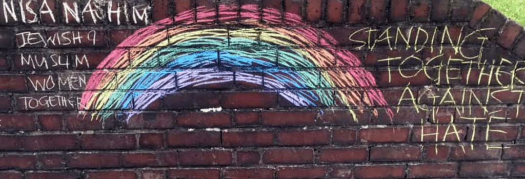 En disparaissant, grâce à l’huile de coude dont elles ont usé avec l’aide d’un agent de police, l’inscription menaçante et injurieuse « Die Jewish » a laissé place à un arc-en-ciel lumineux, masquant la noirceur de l’âme de ses auteurs, avec en exergue une phrase à la forte résonance dont elles ont fait la devise de leur mouvement : « Se tenir ensemble contre la haine – Femmes juives et musulmanes ensemble.»