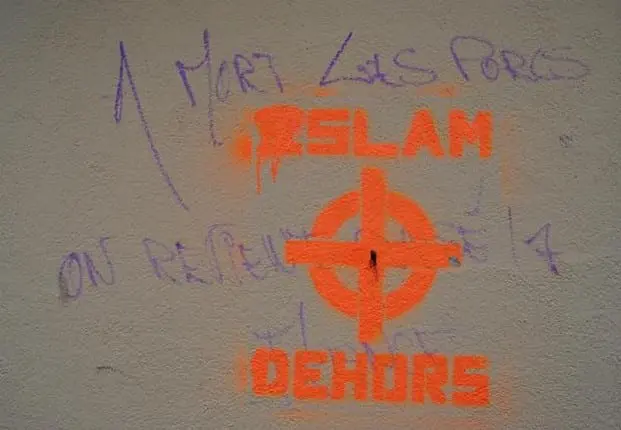 “Islam dehors“. Ces deux petits mots qui claquent comme un “Raus !” bien nazillon, suintant la veine populiste du FN au sommet de son art de l’intimidation, ont été tagués le 26 février dernier sur un mur du marché aux veaux de Saint-Laurent-de-Chamousset, dans le département du Rhône, prélude à une offensive islamophobe de plus grande envergure qui s’en est donnée à cœur joie, à grands coups de croix celtiques badigeonnées à Ste Foy-l’Argentière.