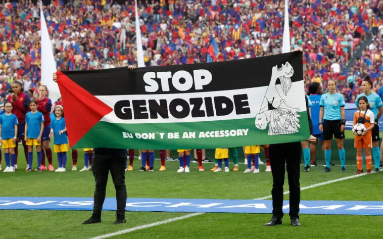 Si la première s’est distinguėe par une mise en scène choc devant la Basilique du Sacré-Coeur, haut lieu du tourisme mondial, la deuxième a créé l’événement lors de la très attendue finale de la Ligue des Champions féminine de l’UEFA entre le FC Barcelone et l’Olympique Lyon, en déployant une bannière sur laquelle figurait en toutes lettres : « Stop au génocide» et « UE ne soyez pas complice ».