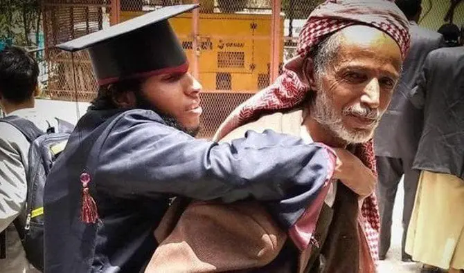 La scène touchante a ému les réseaux sociaux du monde arabe : un père yéménite âgé, que les vicissitudes de la vie, le temps qui passe et les tourments de la guerre n’ont pas épargné, a oublié sa fatigue pour porter sur son dos son fils handicapé, fraîchement diplômé du Centre Al-Noor.